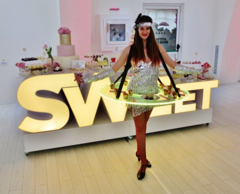 Fiind compatibile cu orice tip de eveniment, Mesele Divine oferă o experiență unică, întâmpinând și servind invitații cu șampanie, cocktailuri, prăjituri, fructe, bomboane și alte delicii.